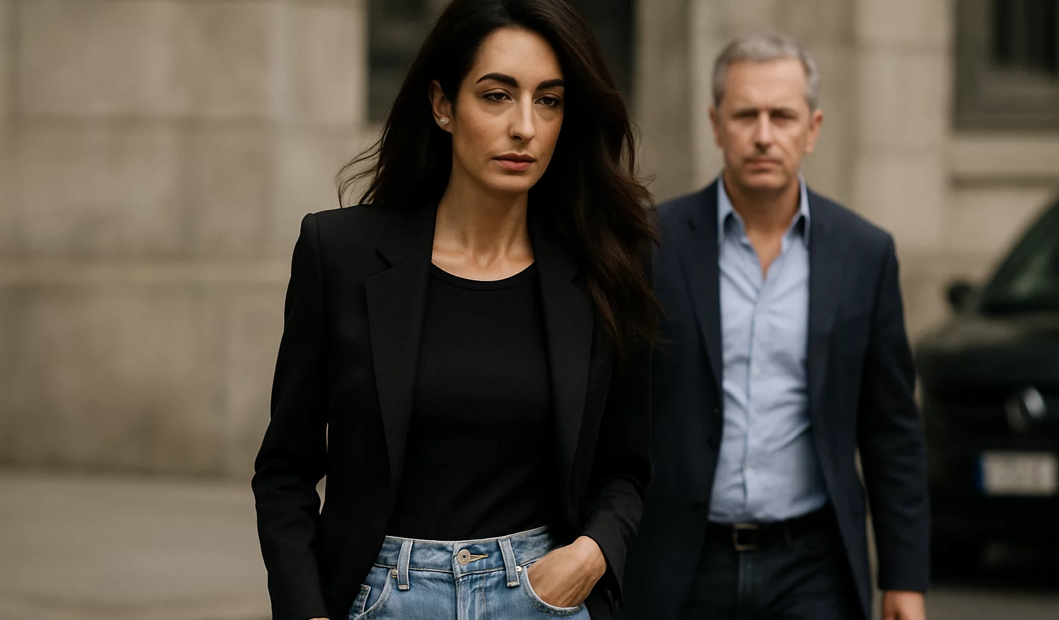 Amal Clooney opte pour des coupes nettes, des matières luxueuses et un maquillage discret; sa coiffure soignée vient compléter l’allure glamour sans surcharger la tenue.