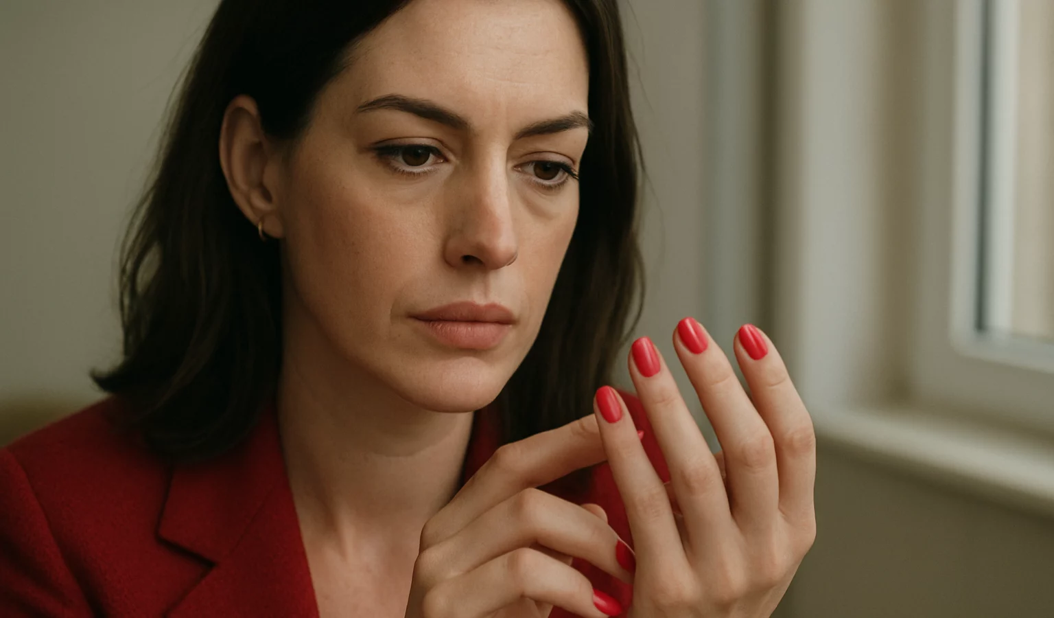 Anne Hathaway a dévoilé une manucure qui associe rose poudré et rouge éclatant, un duo inattendu mais terriblement efficace sur les ongles lors des apparitions promotionnelles.