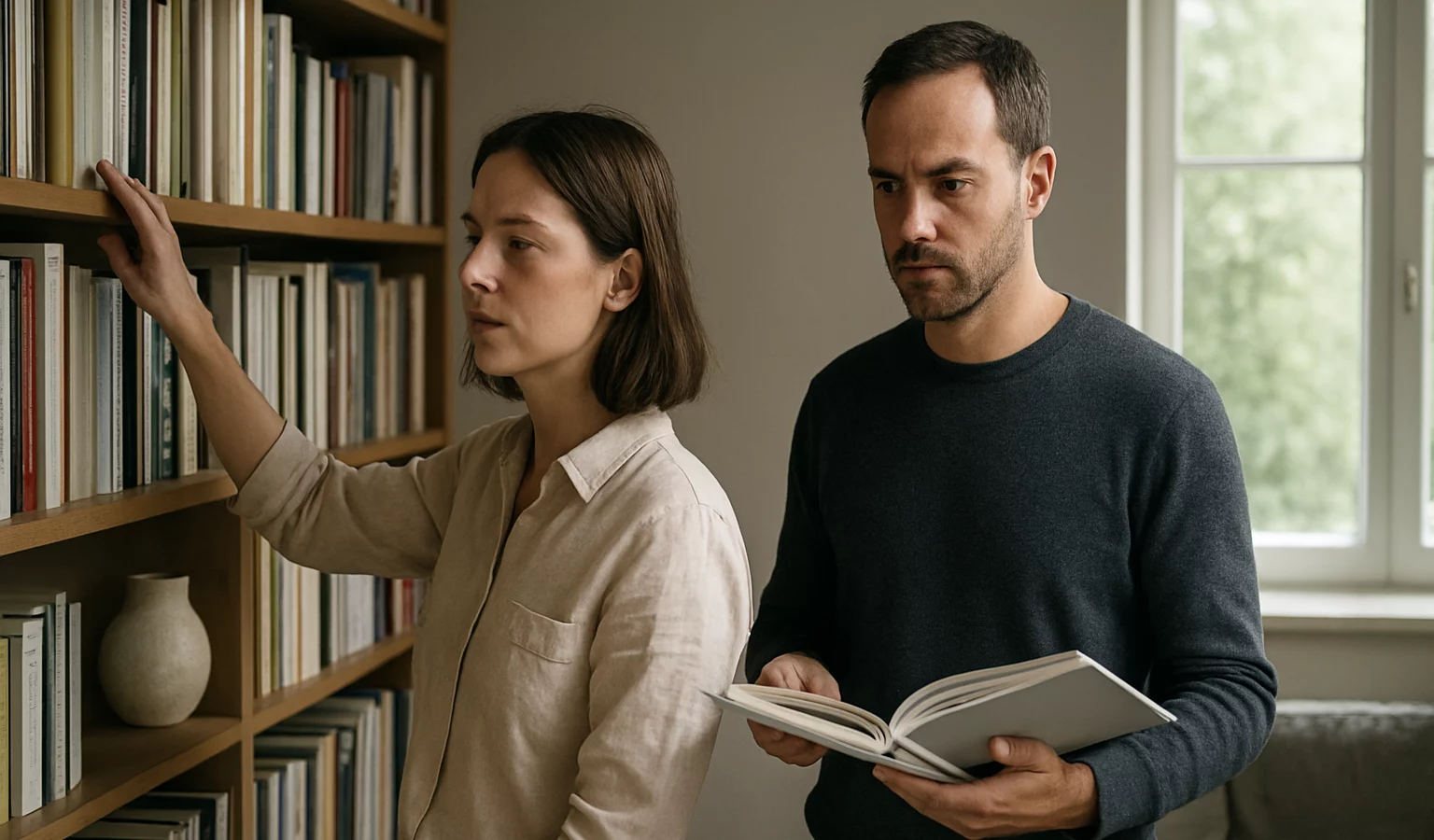 La lumière joue le rôle d’un fil conducteur: lumière naturelle près d’une fenêtre ou lumière chaude dirigée vers les étagères pour éviter les reflets. Des lampes à hauteur d’assise et des abat-jours diffusent une ambiance chaleureuse propice à la lecture.