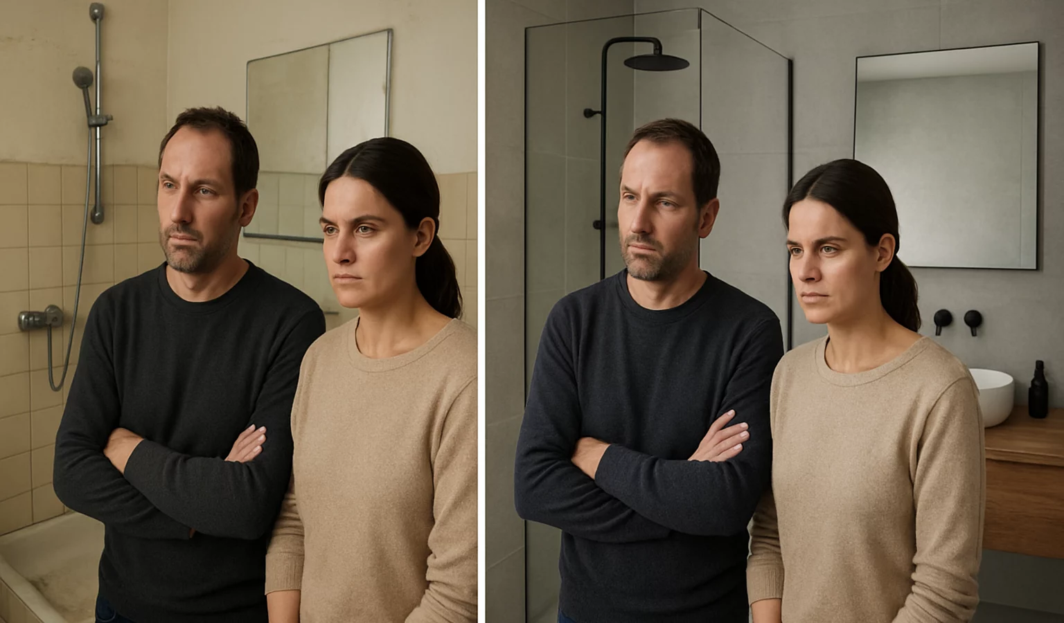 Dans cet appartement, la petite salle d’eau témoignait de son âge : carrelages écaillés, joints ternis et rangements peu pratiques. L’espace semblait serré et chaque geste devenait un défi.