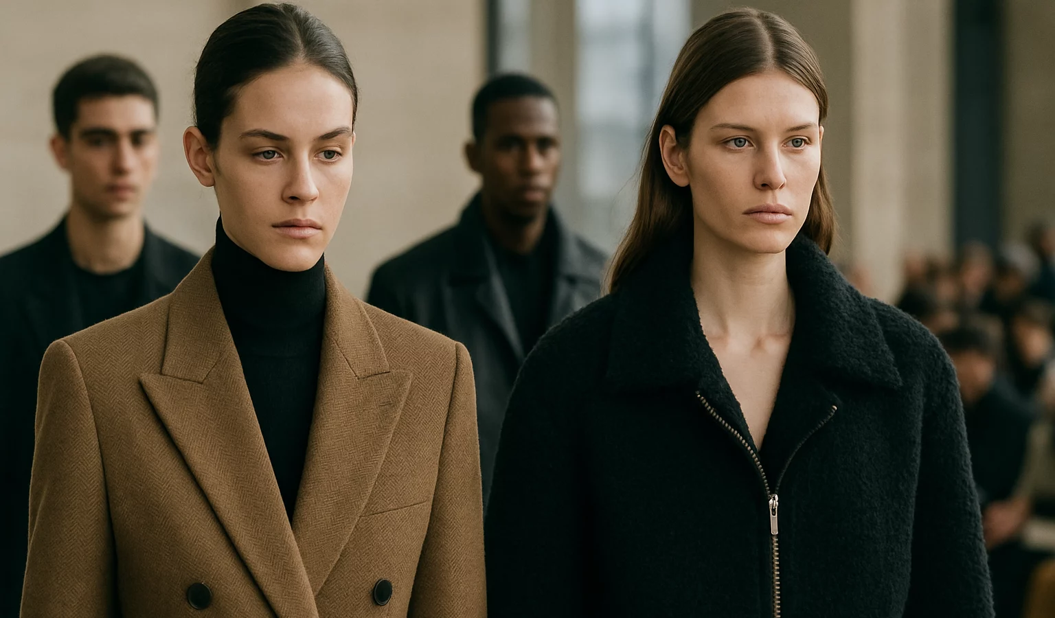 Les matières allient luxe et modernité: velours profond, cuir travaillé, et broderies couleur métal qui scintillent sur robes et jackets, apportant une touche couture au prêt-à-porter.