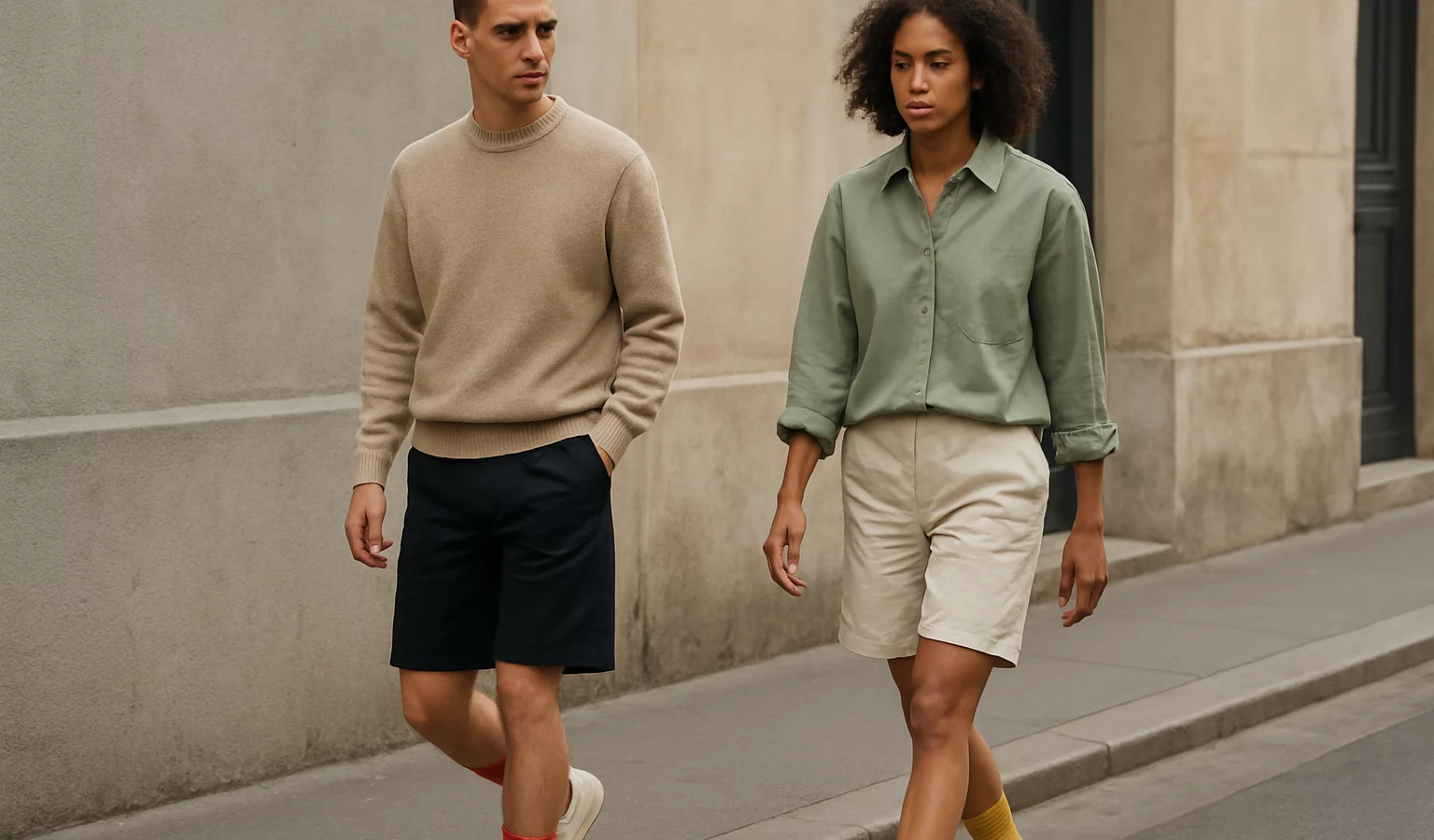Le secret réside dans l’équilibre des longueurs et des matières: un bermuda ajusté se marie avec des chaussettes qui apportent texture et couleur, sans surcharger la silhouette.