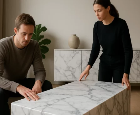 Le marbre veiné allie luxe discret et modernité.