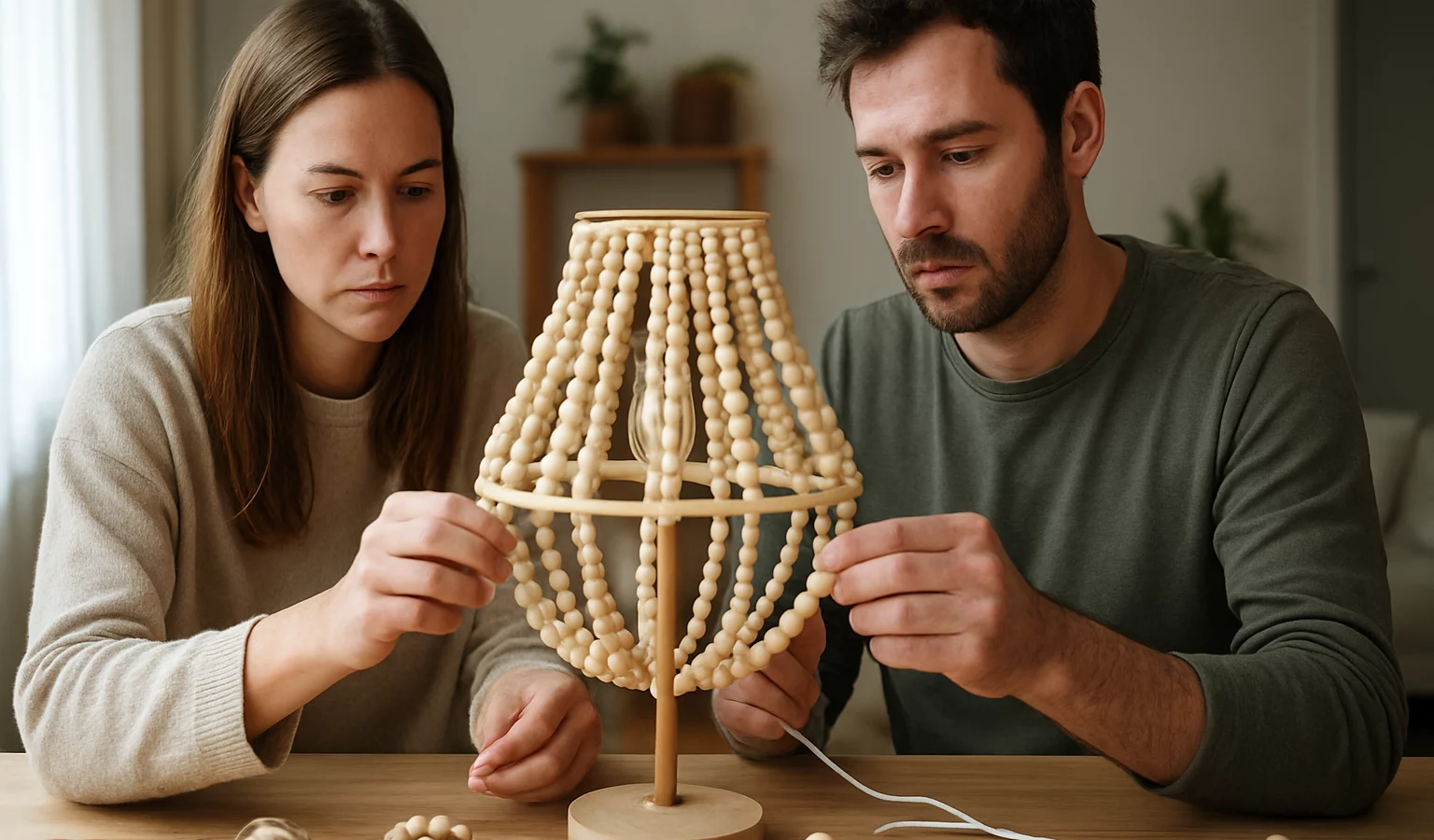 Pour réaliser cette lampe, rassemblez des perles en bois de tailles variées, un cadre métallique ou une rosace lumineuse, une douille avec fil, et une ampoule LED adaptée, ainsi qu’une corde en jute pour relier les éléments. Choisissez une teinte bois claire et des LED à faible consommation pour une ambiance chaleureuse sans surchauffer la pièce.
