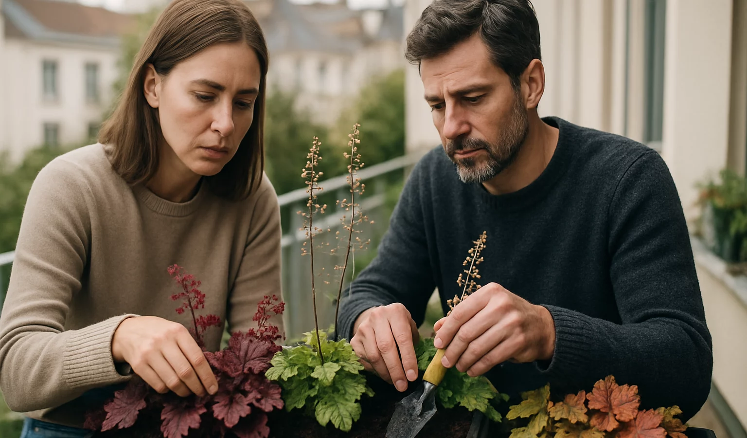 Les heuchères (Heuchera) s’adaptent aussi bien en jardinière que dans les massifs. Plantes vivaces prisées pour leur feuillage décoratif, elles se plaisent dans des sols bien drainés et frais, avec une exposition mi-ombre à ombre légère. Leur surnom poétique, « Désespoir du peintre », témoigne des nuances chatoyantes qui changent au fil des saisons.