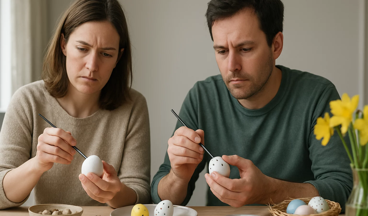 On retrouve des centres de table fleuris, des œufs décorés et des détails en papier découpé qui apportent une touche conviviale sans surcharge.