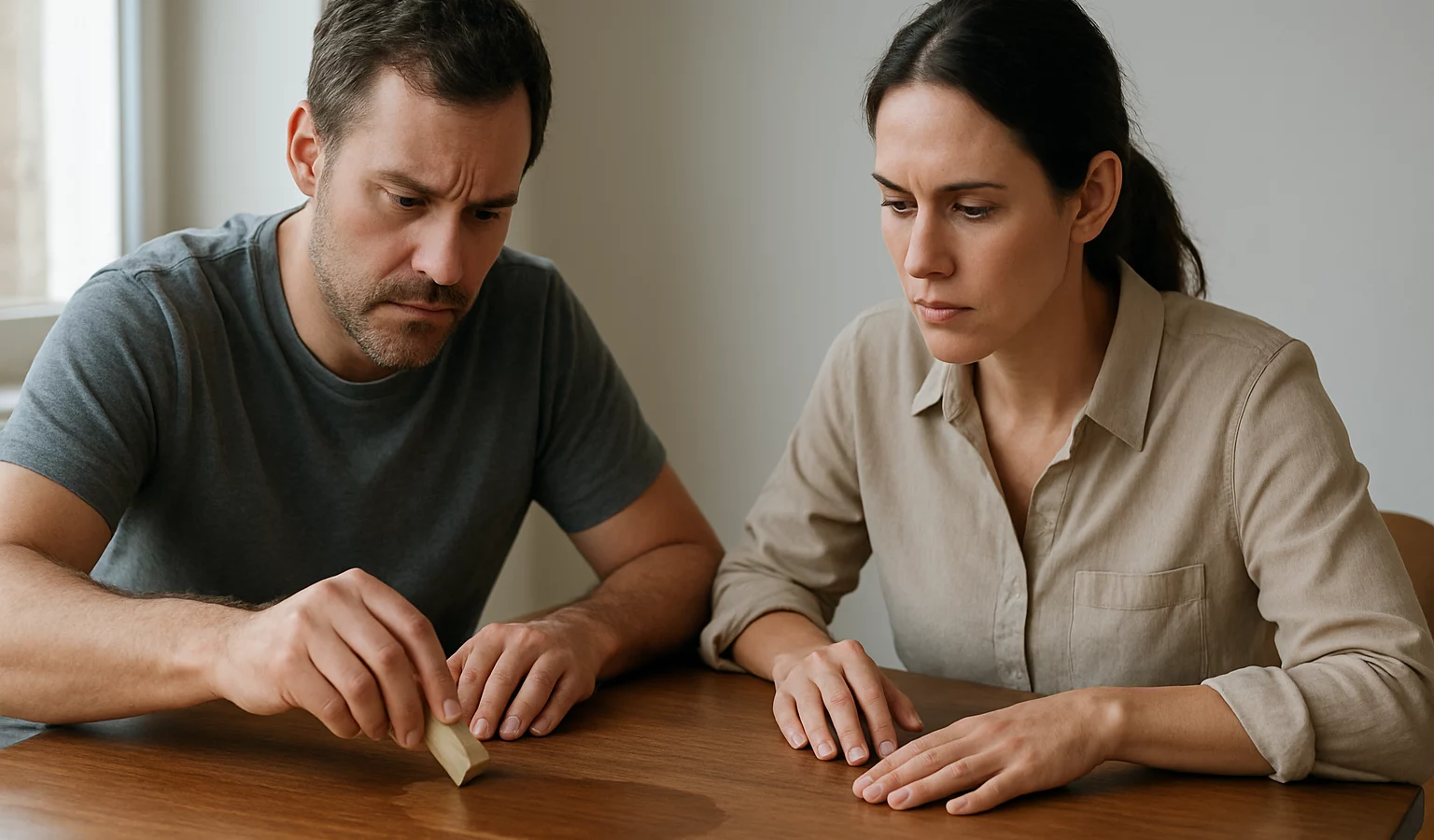 Quand un verre renversé mouille le bois sans sous-bock, l’eau pénètre les fibres et peut laisser un halo après évaporation. Le bois est vivant et se dilate légèrement sous l’humidité, ce qui explique pourquoi la tache peut prendre des tons différents selon le type et la finition.