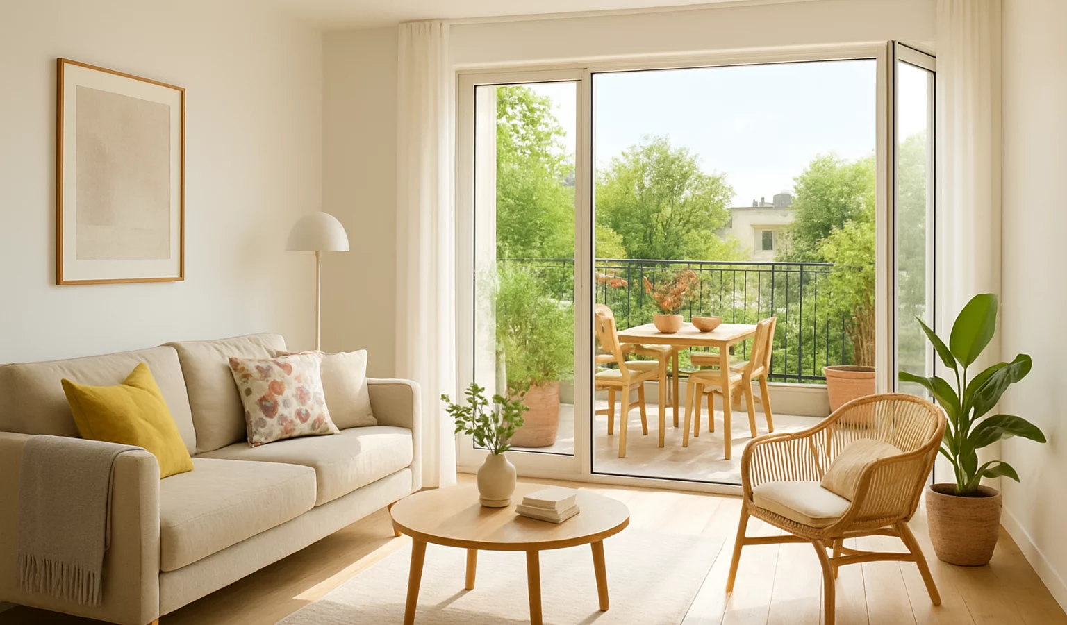 Le mobilier choisi reste compact et modulable pour préserver une circulation facile et éviter l’effet surcharge, tandis que quelques pots et un végétal généreux apportent de la fraîcheur.
